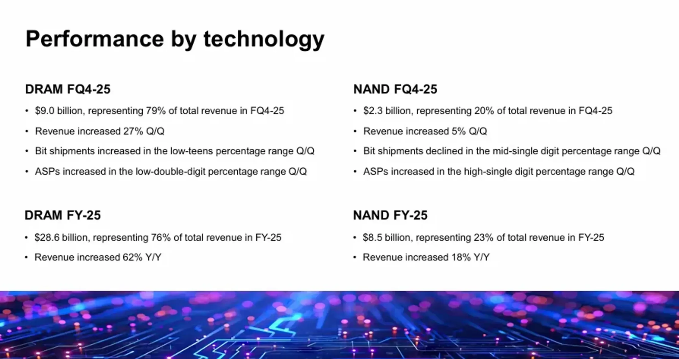 The driver is clear: high-bandwidth memory (HBM) demand from Nvidia and other AI chip players. DRAM revenue grew 69% YoY, HBM specifically is nearing a $2B quarterly run rate. Six firms raised price targets right after the report - Rosenblatt even slapped a $250 PT (stock sits around $165 now).