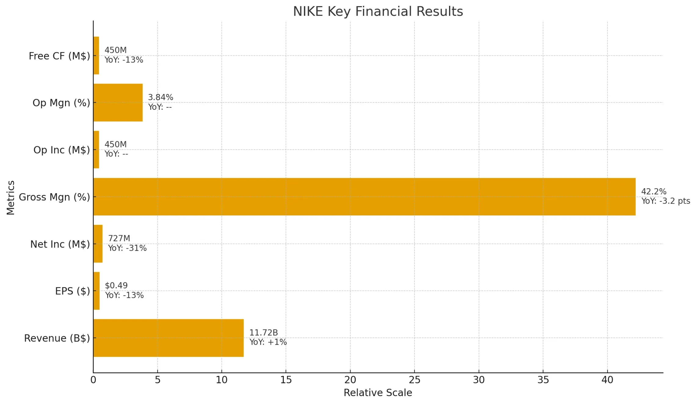 Net income, operating income and free cash flow all declined ~13%, and operating margin around 3.8% is soft for a premium brand. The EPS beat versus lowered estimates doesn’t erase the fact that EPS fell materially versus last year - the divergence between top-line strength and bottom-line health is a red flag. CEO Elliott Hill’s commentary (and the callouts about DTC not rebounding until FY2026) suggests this is more than a cyclical lull - it’s a multi-year repositioning rather than a quick turnaround play.