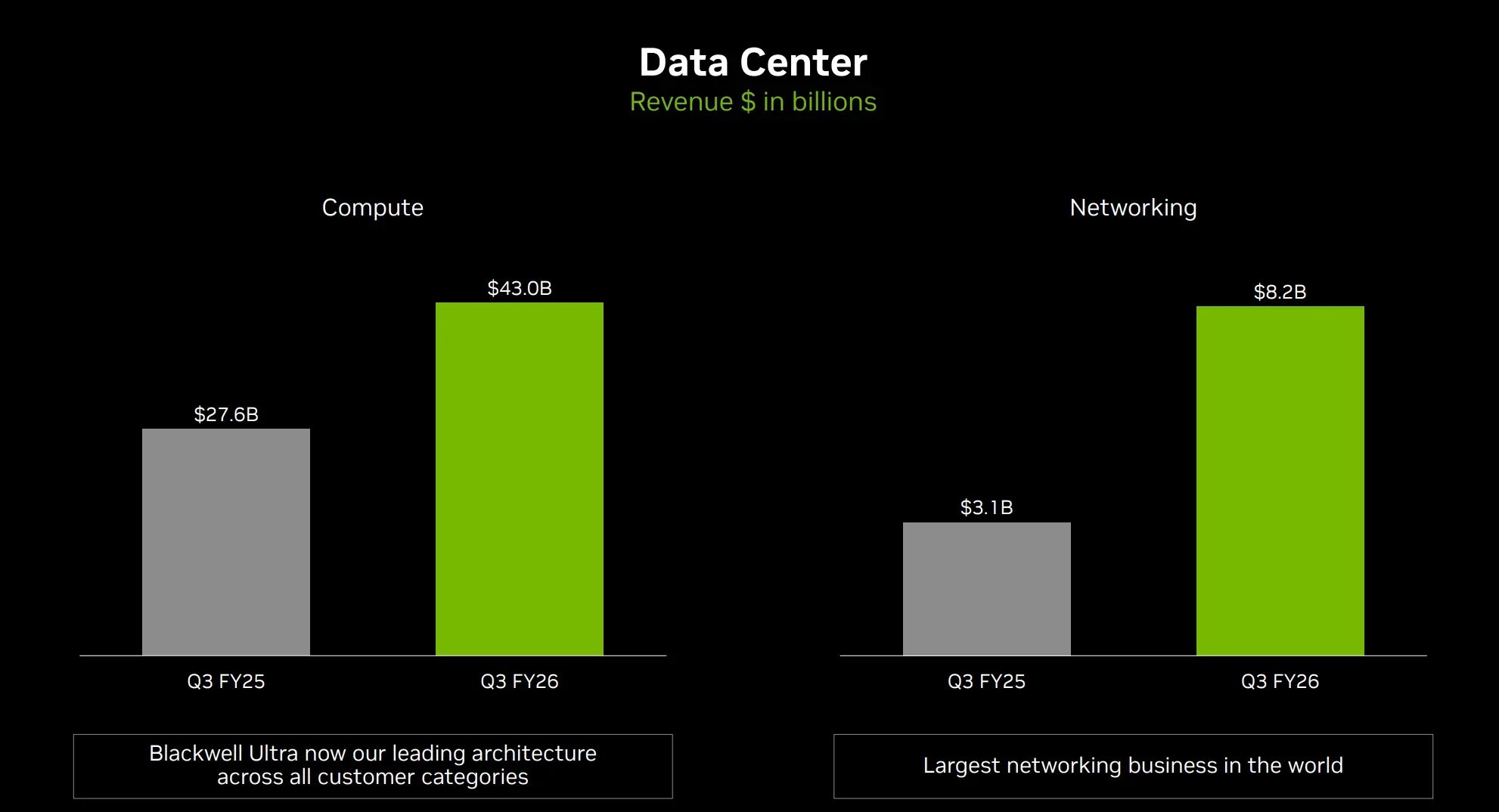Here's what the bears are missing - data center revenue hit $51.2 billion, crushing the $49.09 billion estimate. Of that, $43 billion was pure GPU compute revenue. Jensen Huang said Blackwell sales are "off the charts" and cloud GPUs are completely sold out.