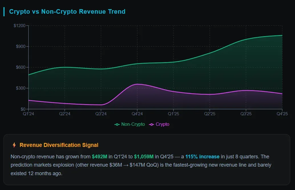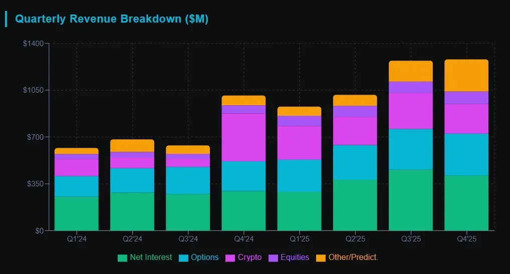 In Q4 2025, options generated $314M, equities $94M, prediction markets and other revenue contributed $147M, and net interest income hit $411M. That’s over $1 billion in non-crypto revenue in a single quarter. The “Financial SuperApp” thesis Vlad Tenev keeps pushing? It’s actually showing up in the numbers.