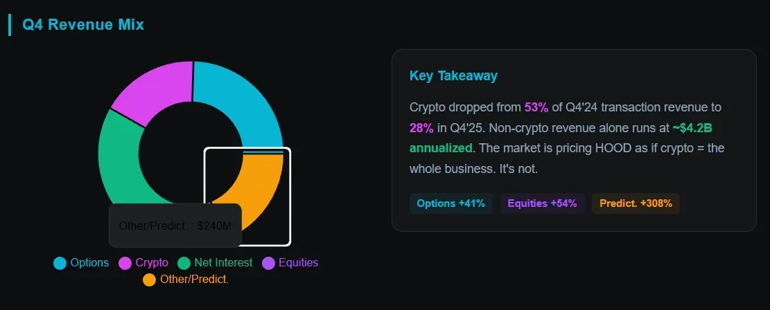 Here’s what the Street is missing: even if crypto stays depressed through 2026, Robinhood’s non-crypto business alone is running at roughly $4.2 billion annualized. That’s almost the entire 2025 full-year revenue including crypto’s contribution. The diversification story isn’t just talk anymore.
