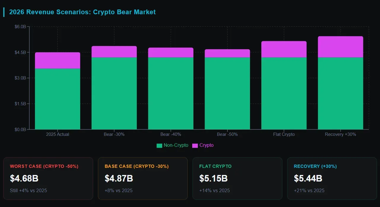 Bear case crypto revenue 2026: $475-570M (down 40-50% from 2025)