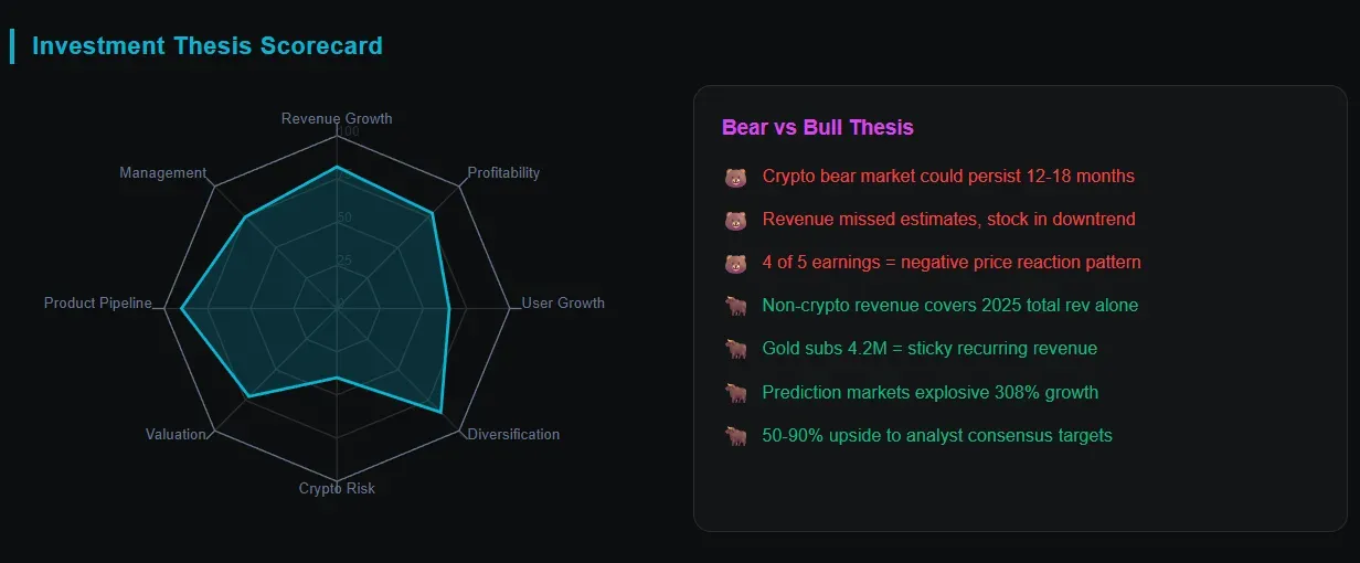 The real question isn’t whether Robinhood survives a crypto bear market - it’s whether the market re-rates the stock when it realizes crypto is no longer the dominant revenue driver. At current levels around $79 with roughly $2.05 in trailing EPS, you’re looking at a ~38x trailing P/E. For a company growing revenue 27-52% with 11+ business lines generating $100M+ annualized revenue, that’s not exactly expensive - especially compared to where the stock traded 4 months ago.
