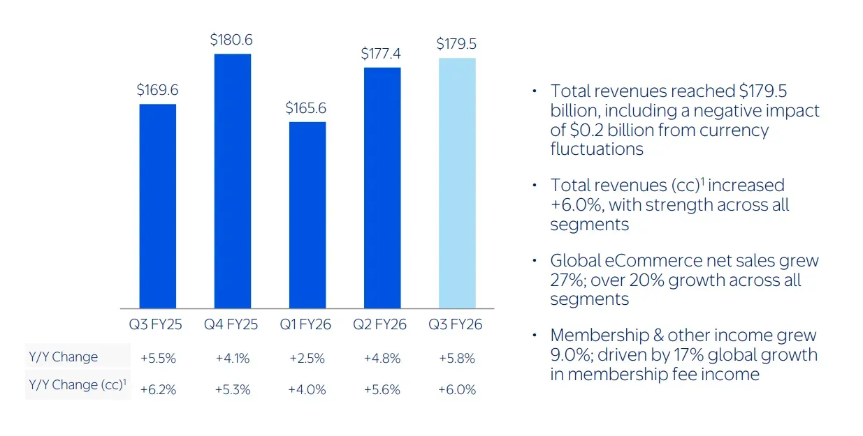 Walmart delivered $0.62 EPS versus the Street's $0.60 - not a massive beat, but here's what's interesting: revenue hit $179.5B, smashing the $177.6B consensus with 6% year-over-year growth. Same-store sales in the US jumped 4.5% against 4% expectations. But the real story? Online sales exploded 27% globally.