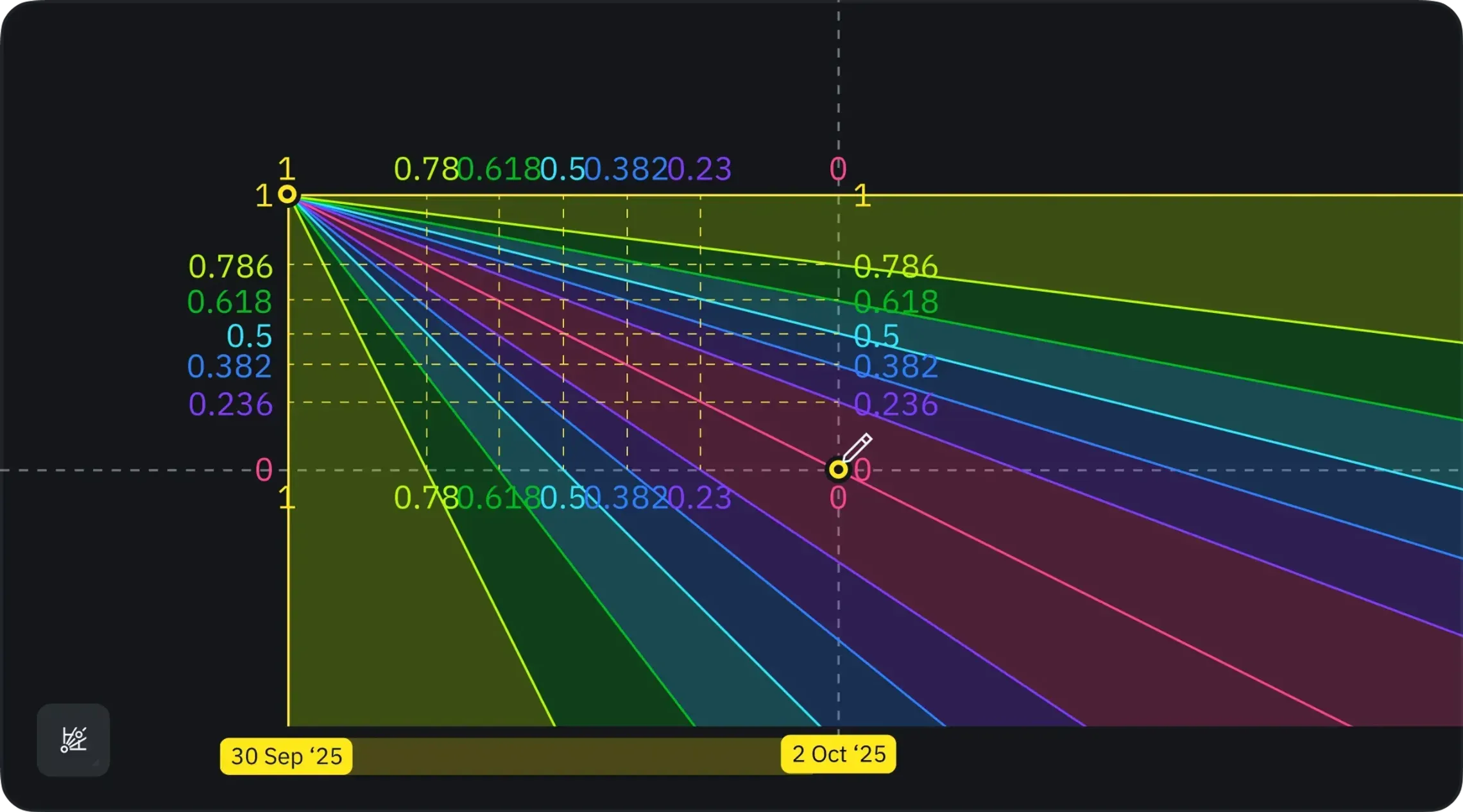 Fib Time Zone marks vertical lines at Fibonacci intervals (1, 2, 3, 5, 8, 13, 21…) to forecast when pivots or reversals might hit. It's time-based analysis that complements your price work. Learn more about Fibonacci Tools →